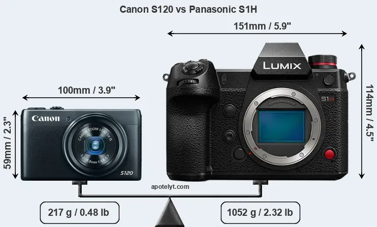 An illustration of the physical size and weight of the Canon S120 and the Panasonic S1H is provided in the side-by-side display below. The two cameras are presented according to their relative size. Three successive views from the front, the top, and the rear are shown. All width, height and depth dimensions are rounded to the nearest millimeter.