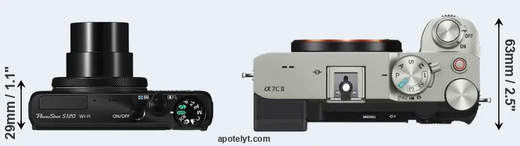 The physical size and weight of the Canon S120 and the Sony A7C II are illustrated in the side-by-side display below. The two cameras are presented according to their relative size. Three consecutive perspectives from the front, the top, and the back are available. All width, height and depth dimensions are rounded to the nearest millimeter.