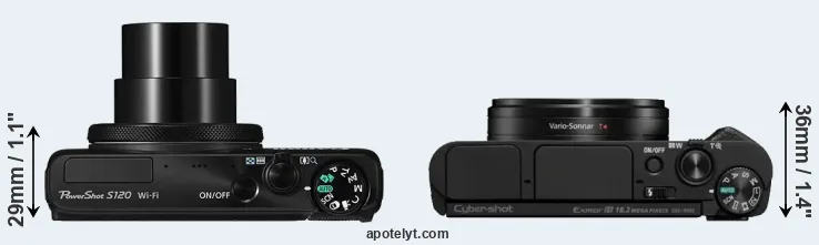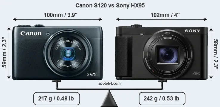 The side-by-side display below illustrates the physical size and weight of the Canon S120 and the Sony HX95. The two cameras are presented according to their relative size. Three successive views from the front, the top, and the rear are shown. All width, height and depth measures are rounded to the nearest millimeter.