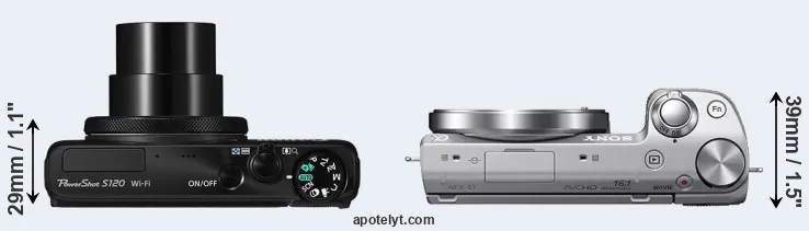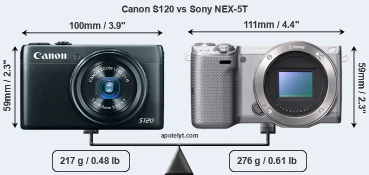 If the front view area (width x height) of the cameras is taken as an aggregate measure of their size, the Sony NEX-5T is notably larger (11 percent) than the Canon S120. In this context, it is worth noting that neither the S120 nor the NEX-5T are weather-sealed.