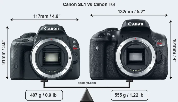 The physical size and weight of the Canon SL1 and the Canon T6i are illustrated in the side-by-side display below. The two cameras are presented according to their relative size. Three consecutive perspectives from the front, the top, and the back are available. All width, height and depth dimensions are rounded to the nearest millimeter.