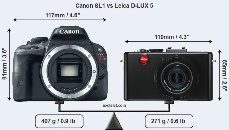 The side-by-side display below illustrates the physical size and weight of the Canon SL1 and the Leica D-LUX 5. The two cameras are presented according to their relative size. Three consecutive views from the front, the top, and the rear side are shown. All width, height and depth measures are rounded to the nearest millimeter.
