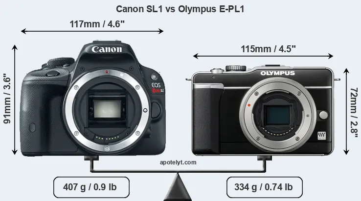 The side-by-side display below illustrates the physical size and weight of the Canon SL1 and the Olympus E-PL1. The two cameras are presented according to their relative size. Three consecutive perspectives from the front, the top, and the back are available. All width, height and depth measures are rounded to the nearest millimeter.