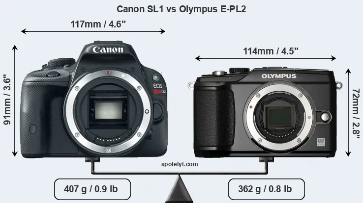 The side-by-side display below illustrates the physical size and weight of the Canon SL1 and the Olympus E-PL2. The two cameras are presented according to their relative size. Three consecutive perspectives from the front, the top, and the back are available. All width, height and depth measures are rounded to the nearest millimeter.