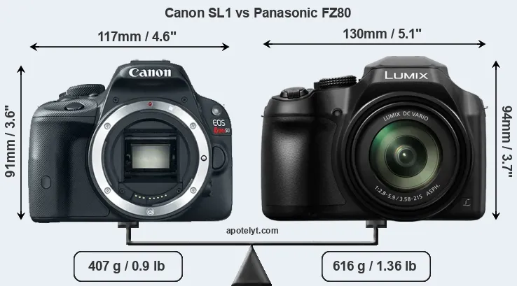 An illustration of the physical size and weight of the Canon SL1 and the Panasonic FZ80 is provided in the side-by-side display below. The two cameras are presented according to their relative size. Three successive views from the front, the top, and the rear are shown. All width, height and depth dimensions are rounded to the nearest millimeter.