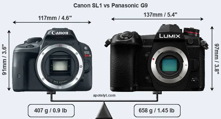 If the front view area (width x height) of the cameras is taken as an aggregate measure of their size, the Panasonic G9 is notably larger (25 percent) than the Canon SL1. Moreover, the G9 is substantially heavier (62 percent) than the SL1. It is noteworthy in this context that the G9 is splash and dust-proof, while the SL1 does not feature any corresponding weather-sealing.