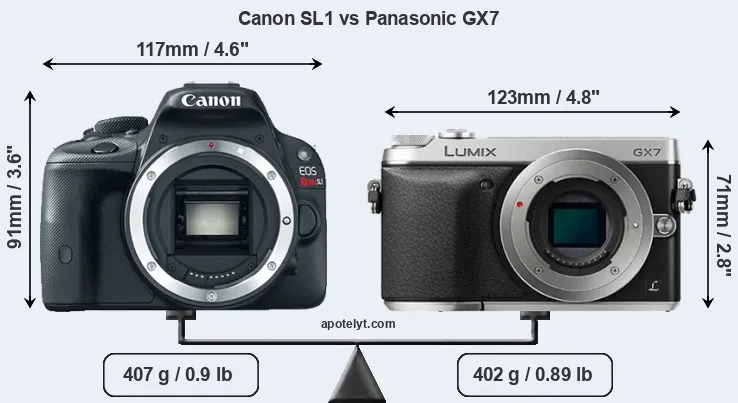 An illustration of the physical size and weight of the Canon SL1 and the Panasonic GX7 is provided in the side-by-side display below. The two cameras are presented according to their relative size. Three consecutive views from the front, the top, and the rear side are shown. All width, height and depth dimensions are rounded to the nearest millimeter.
