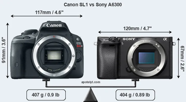 If the front view area (width x height) of the cameras is taken as an aggregate measure of their size, the Sony A6300 is notably smaller (24 percent) than the Canon SL1. Moreover, the A6300 is slightly lighter (1 percent) than the SL1. It is noteworthy in this context that the A6300 is splash and dust-proof, while the SL1 does not feature any corresponding weather-sealing.