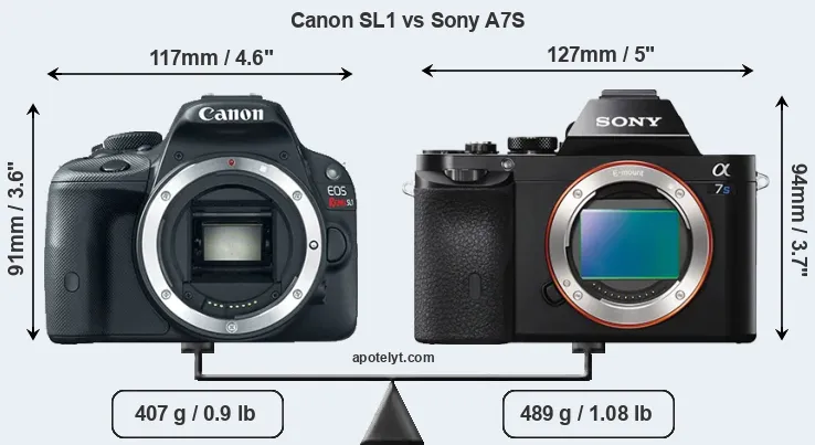 If the front view area (width x height) of the cameras is taken as an aggregate measure of their size, the Sony A7S is notably larger (12 percent) than the Canon SL1. Moreover, the A7S is markedly heavier (20 percent) than the SL1. It is noteworthy in this context that the A7S is splash and dust-proof, while the SL1 does not feature any corresponding weather-sealing.
