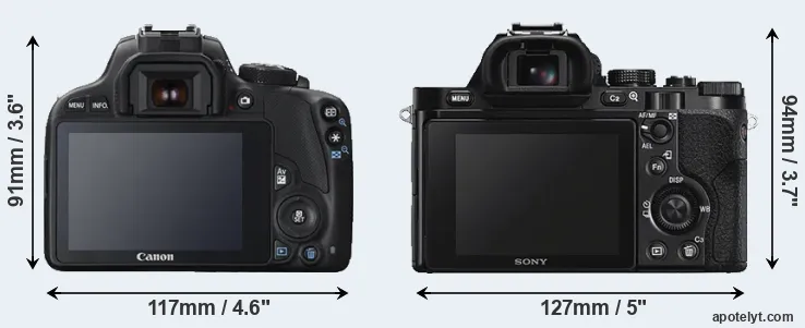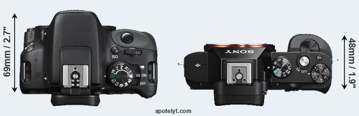 An illustration of the physical size and weight of the Canon SL1 and the Sony A7S is provided in the side-by-side display below. The two cameras are presented according to their relative size. Three consecutive perspectives from the front, the top, and the back are available. All size dimensions are rounded to the nearest millimeter.