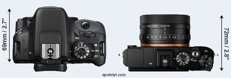 The physical size and weight of the Canon SL1 and the Sony RX1R II are illustrated in the side-by-side display below. The two cameras are presented according to their relative size. Three consecutive views from the front, the top, and the rear side are shown. All width, height and depth dimensions are rounded to the nearest millimeter.