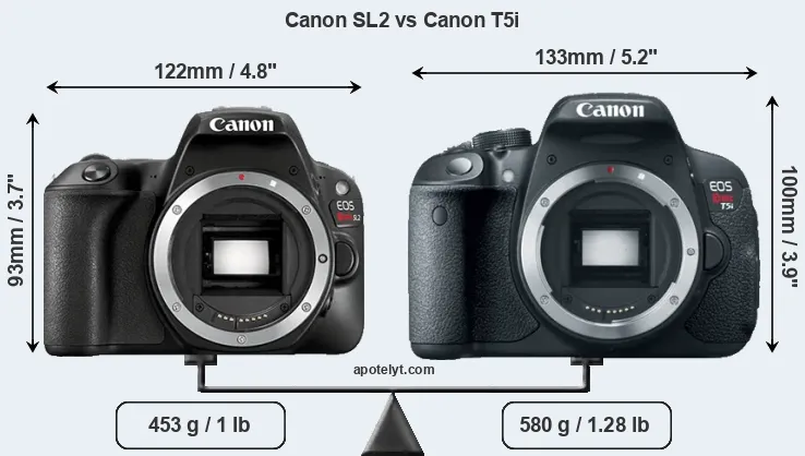 If the front view area (width x height) of the cameras is taken as an aggregate measure of their size, the Canon T5i is notably larger (17 percent) than the Canon SL2. Moreover, the T5i is markedly heavier (28 percent) than the SL2. In this context, it is worth noting that neither the SL2 nor the T5i are weather-sealed.