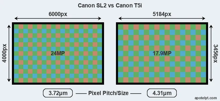 While the two cameras under review share the same sensor size, the SL2 offers a higher resolution of 24 megapixels, compared with 17.9 MP of the T5i. This megapixels advantage translates into a 16 percent gain in linear resolution. On the other hand, these sensor specs imply that the SL2 has a higher pixel density and a smaller size of the individual pixel (with a pixel pitch of 3.72μm versus 4.31μm for the T5i). In this context, it should be noted, however, that the SL2 is much more recent (by 4 years and 3 months) than the T5i, and its sensor will have benefitted from technological advances during this time that compensate for the smaller pixel size.