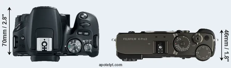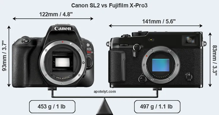 An illustration of the physical size and weight of the Canon SL2 and the Fujifilm X-Pro3 is provided in the side-by-side display below. The two cameras are presented according to their relative size. Three successive views from the front, the top, and the rear are shown. All width, height and depth dimensions are rounded to the nearest millimeter.