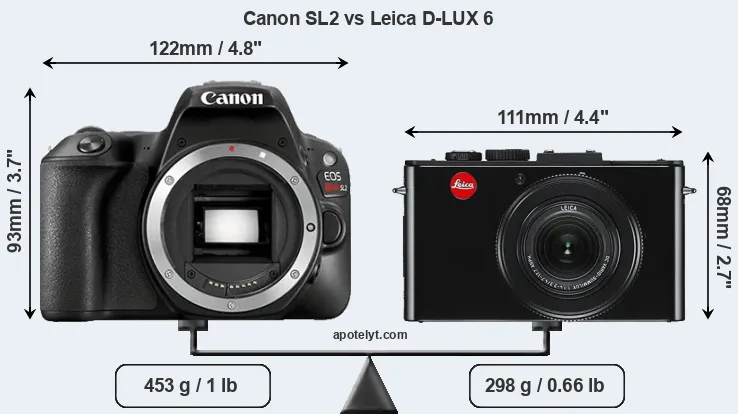 The side-by-side display below illustrates the physical size and weight of the Canon SL2 and the Leica D-LUX 6. The two cameras are presented according to their relative size. Three consecutive views from the front, the top, and the rear side are shown. All width, height and depth measures are rounded to the nearest millimeter.