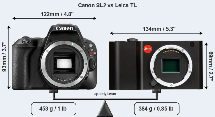 An illustration of the physical size and weight of the Canon SL2 and the Leica TL is provided in the side-by-side display below. The two cameras are presented according to their relative size. Three consecutive perspectives from the front, the top, and the back are available. All size dimensions are rounded to the nearest millimeter.