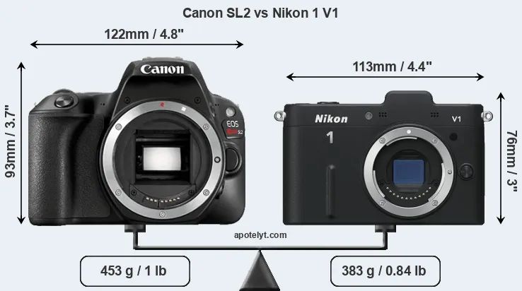 The physical size and weight of the Canon SL2 and the Nikon 1 V1 are illustrated in the side-by-side display below. The two cameras are presented according to their relative size. Three successive views from the front, the top, and the rear are shown. All width, height and depth measures are rounded to the nearest millimeter.