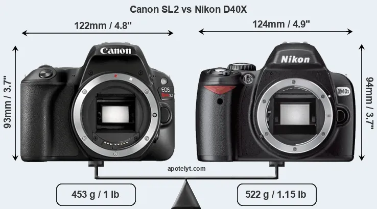 The physical size and weight of the Canon SL2 and the Nikon D40X are illustrated in the side-by-side display below. The two cameras are presented according to their relative size. Three successive views from the front, the top, and the rear are shown. All size dimensions are rounded to the nearest millimeter.