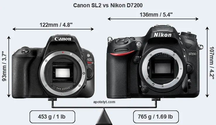 The physical size and weight of the Canon SL2 and the Nikon D7200 are illustrated in the side-by-side display below. The two cameras are presented according to their relative size. Three consecutive perspectives from the front, the top, and the back are available. All width, height and depth dimensions are rounded to the nearest millimeter.