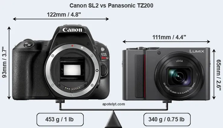 An illustration of the physical size and weight of the Canon SL2 and the Panasonic TZ200 is provided in the side-by-side display below. The two cameras are presented according to their relative size. Three successive views from the front, the top, and the rear are shown. All size dimensions are rounded to the nearest millimeter.