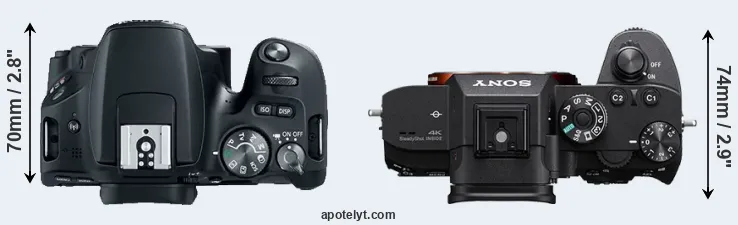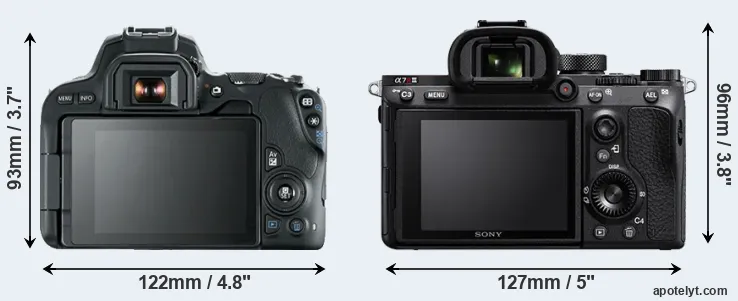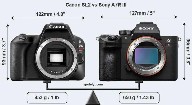 The side-by-side display below illustrates the physical size and weight of the Canon SL2 and the Sony A7R III. The two cameras are presented according to their relative size. Three consecutive perspectives from the front, the top, and the back are available. All width, height and depth measures are rounded to the nearest millimeter.