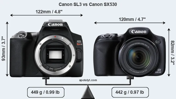 The above size and weight comparisons are to some extent incomplete and possibly misleading, as the SX530 has a lens built in, whereas the SL3 is an interchangeable lens camera that requires a separate lens. Attaching the latter will add extra weight and bulk to the setup. You can compare the optics available for the SL3 and their specifications in the Canon EF Lens Catalog.