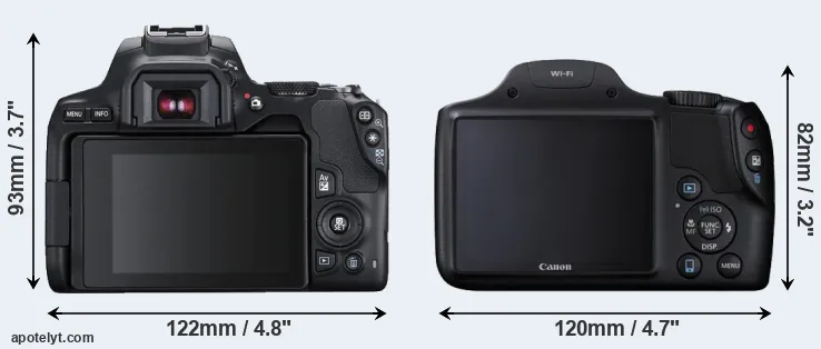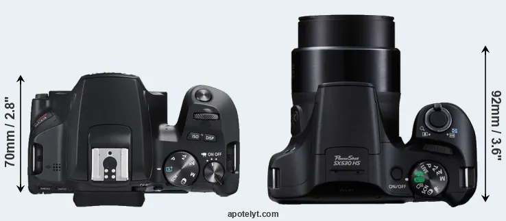 The side-by-side display below illustrates the physical size and weight of the Canon SL3 and the Canon SX530. The two cameras are presented according to their relative size. Three consecutive views from the front, the top, and the rear side are shown. All width, height and depth measures are rounded to the nearest millimeter.
