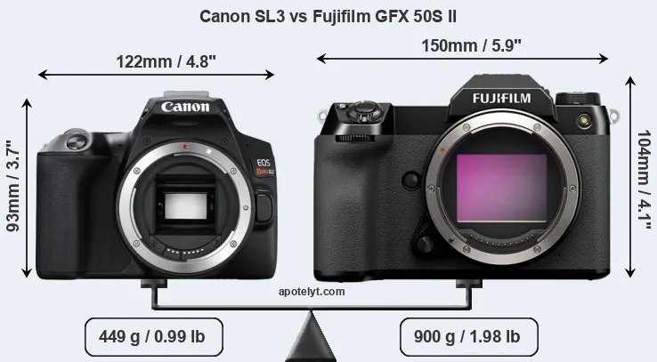 The physical size and weight of the Canon SL3 and the Fujifilm GFX 50S II are illustrated in the side-by-side display below. The two cameras are presented according to their relative size. Three successive views from the front, the top, and the rear are shown. All width, height and depth dimensions are rounded to the nearest millimeter.
