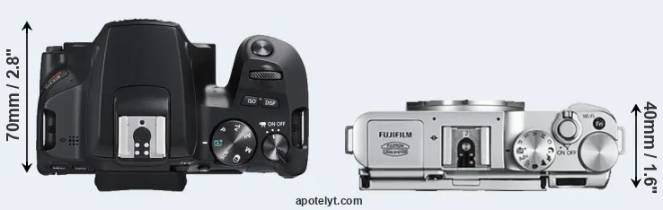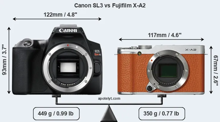 The side-by-side display below illustrates the physical size and weight of the Canon SL3 and the Fujifilm X-A2. The two cameras are presented according to their relative size. Three consecutive perspectives from the front, the top, and the back are available. All width, height and depth dimensions are rounded to the nearest millimeter.