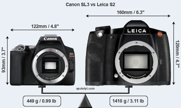 If the front view area (width x height) of the cameras is taken as an aggregate measure of their size, the Leica S2 is considerably larger (69 percent) than the Canon SL3. Moreover, the S2 is substantially heavier (214 percent) than the SL3. It is noteworthy in this context that the S2 is splash and dust-proof, while the SL3 does not feature any corresponding weather-sealing.