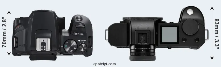 The side-by-side display below illustrates the physical size and weight of the Canon SL3 and the Leica SL2-S. The two cameras are presented according to their relative size. Three consecutive perspectives from the front, the top, and the back are available. All width, height and depth measures are rounded to the nearest millimeter.