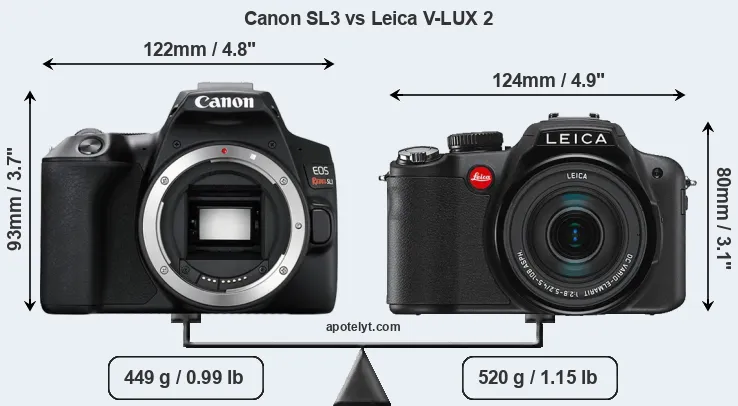The side-by-side display below illustrates the physical size and weight of the Canon SL3 and the Leica V-LUX 2. The two cameras are presented according to their relative size. Three consecutive perspectives from the front, the top, and the back are available. All size dimensions are rounded to the nearest millimeter.