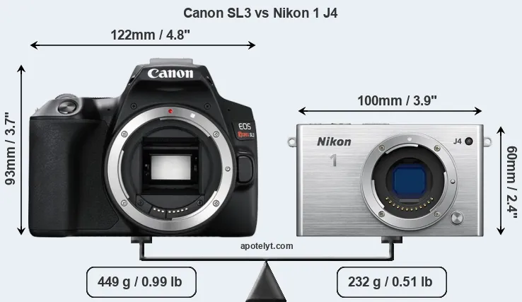 The side-by-side display below illustrates the physical size and weight of the Canon SL3 and the Nikon 1 J4. The two cameras are presented according to their relative size. Three successive views from the front, the top, and the rear are shown. All size dimensions are rounded to the nearest millimeter.