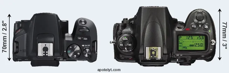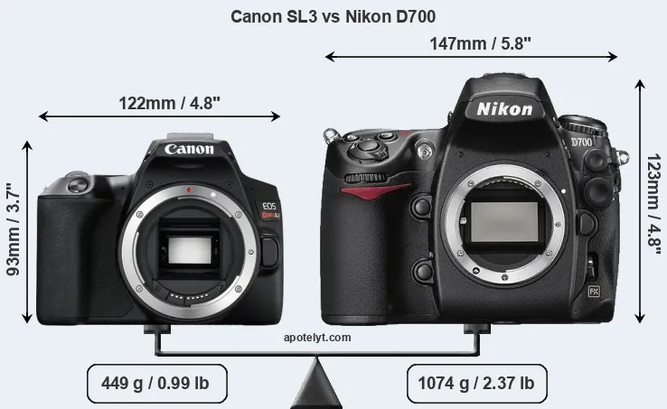 The side-by-side display below illustrates the physical size and weight of the Canon SL3 and the Nikon D700. The two cameras are presented according to their relative size. Three consecutive views from the front, the top, and the rear side are shown. All width, height and depth dimensions are rounded to the nearest millimeter.