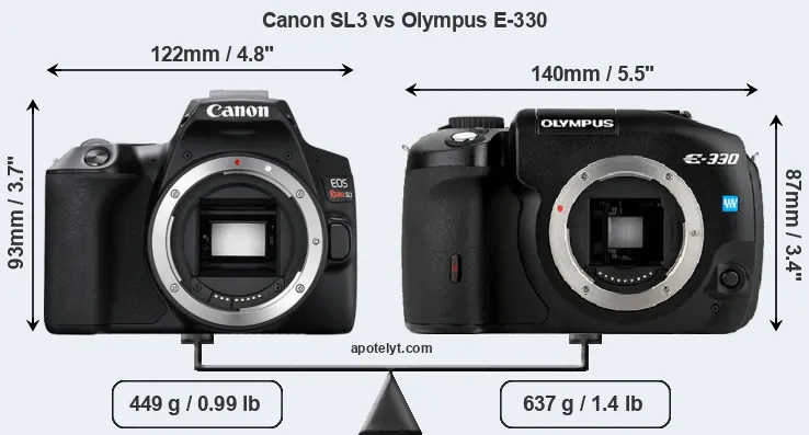 An illustration of the physical size and weight of the Canon SL3 and the Olympus E-330 is provided in the side-by-side display below. The two cameras are presented according to their relative size. Three consecutive perspectives from the front, the top, and the back are available. All width, height and depth dimensions are rounded to the nearest millimeter.