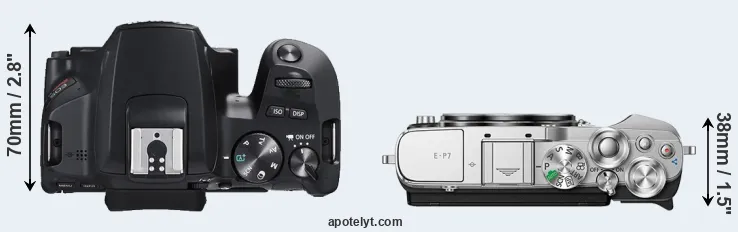 An illustration of the physical size and weight of the Canon SL3 and the Olympus E-P7 is provided in the side-by-side display below. The two cameras are presented according to their relative size. Three consecutive views from the front, the top, and the rear side are shown. All width, height and depth measures are rounded to the nearest millimeter.