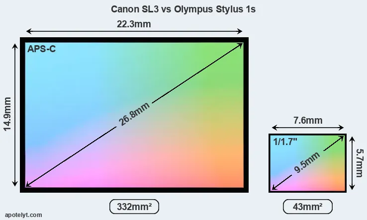Of the two cameras under consideration, the Canon SL3 features an APS-C sensor and the Olympus Stylus 1s a 1/1.7-inch sensor. The sensor area in the Stylus 1s is 87 percent smaller. As a result of these sensor size differences, the cameras have a format factor of, respectively, 1.6 and 4.5. The sensor in the SL3 has a native 3:2 aspect ratio, while the one in the Stylus 1s offers a 4:3 aspect.