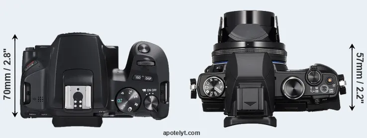 The side-by-side display below illustrates the physical size and weight of the Canon SL3 and the Olympus Stylus 1s. The two cameras are presented according to their relative size. Three successive views from the front, the top, and the rear are shown. All width, height and depth measures are rounded to the nearest millimeter.