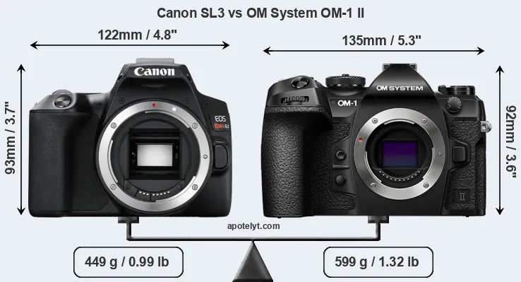 The side-by-side display below illustrates the physical size and weight of the Canon SL3 and the OM System OM-1 II. The two cameras are presented according to their relative size. Three successive views from the front, the top, and the rear are shown. All width, height and depth dimensions are rounded to the nearest millimeter.