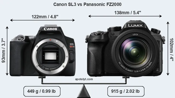 The physical size and weight of the Canon SL3 and the Panasonic FZ2000 are illustrated in the side-by-side display below. The two cameras are presented according to their relative size. Three consecutive perspectives from the front, the top, and the back are available. All width, height and depth dimensions are rounded to the nearest millimeter.
