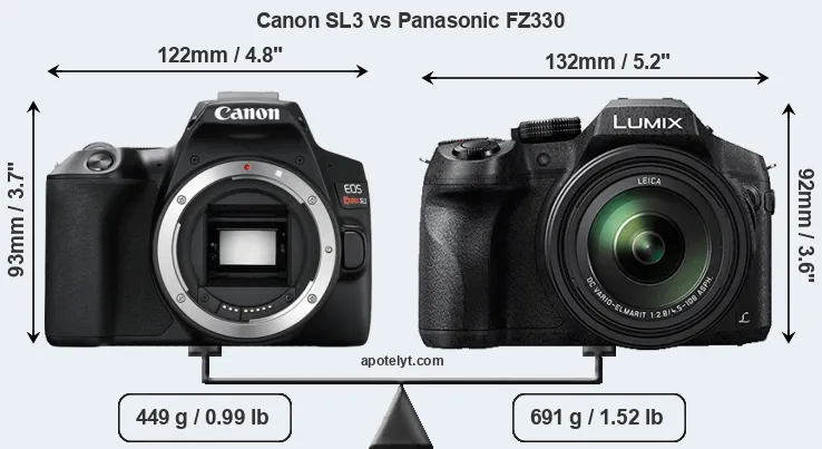 The above size and weight comparisons are to some extent incomplete and possibly misleading, as the FZ330 has a lens built in, whereas the SL3 is an interchangeable lens camera that requires a separate lens. Attaching the latter will add extra weight and bulk to the setup. You can compare the optics available for the SL3 and their specifications in the Canon EF Lens Catalog.
