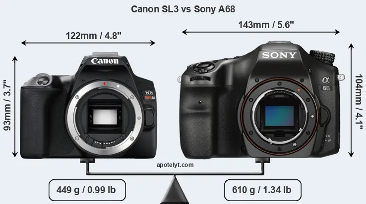 If the front view area (width x height) of the cameras is taken as an aggregate measure of their size, the Sony A68 is notably larger (31 percent) than the Canon SL3. Moreover, the A68 is substantially heavier (36 percent) than the SL3. In this context, it is worth noting that neither the SL3 nor the A68 are weather-sealed.