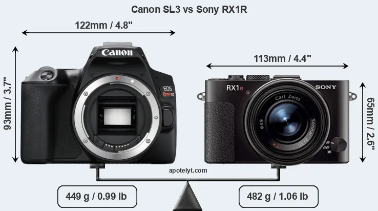 An illustration of the physical size and weight of the Canon SL3 and the Sony RX1R is provided in the side-by-side display below. The two cameras are presented according to their relative size. Three consecutive views from the front, the top, and the rear side are shown. All width, height and depth measures are rounded to the nearest millimeter.