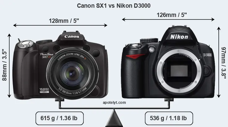 The physical size and weight of the Canon SX1 and the Nikon D3000 are illustrated in the side-by-side display below. The two cameras are presented according to their relative size. Three consecutive perspectives from the front, the top, and the back are available. All width, height and depth dimensions are rounded to the nearest millimeter.