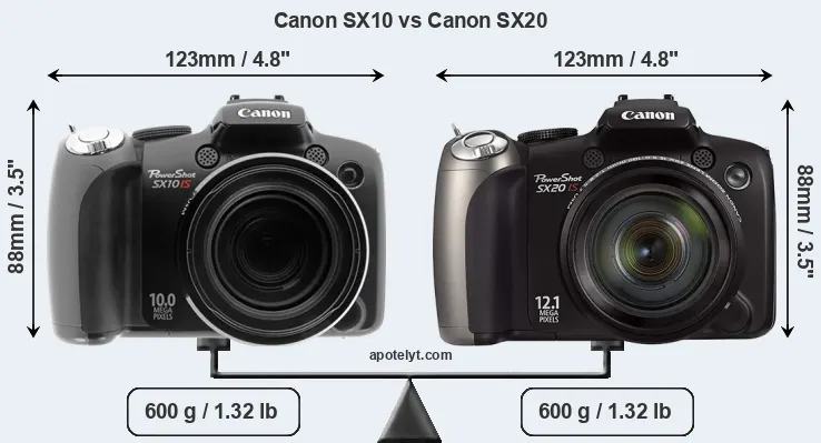 An illustration of the physical size and weight of the Canon SX10 and the Canon SX20 is provided in the side-by-side display below. The two cameras are presented according to their relative size. Three successive views from the front, the top, and the rear are shown. All width, height and depth measures are rounded to the nearest millimeter.