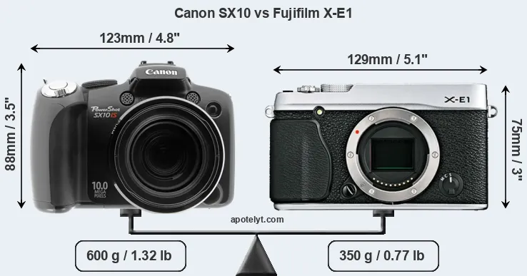 The side-by-side display below illustrates the physical size and weight of the Canon SX10 and the Fujifilm X-E1. The two cameras are presented according to their relative size. Three consecutive perspectives from the front, the top, and the back are available. All width, height and depth measures are rounded to the nearest millimeter.