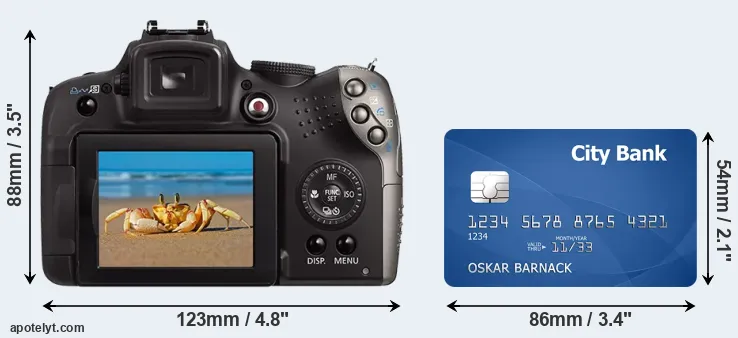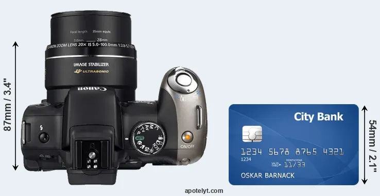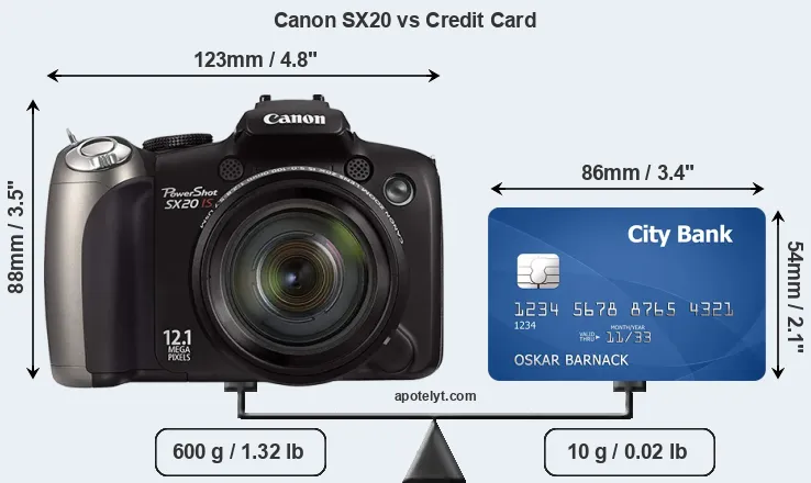 The physical dimensions of the Canon SX20 relative to a credit card are illustrated in the side-by-side display below. Three successive views from the front, the top, and the rear are shown. All width, height and depth measures are rounded to the nearest millimeter.