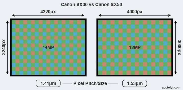While the two cameras under review share the same sensor size, the SX30 offers a higher resolution of 14 megapixels, compared with 12 MP of the SX50. This megapixels advantage translates into a 8 percent gain in linear resolution. On the other hand, these sensor specs imply that the SX30 has a higher pixel density and a smaller size of the individual pixel (with a pixel pitch of 1.41μm versus 1.53μm for the SX50). Moreover, it should be noted that the SX50 is much more recent (by 2 years) than the SX30, and its sensor will have benefitted from technological advances during this time that further enhance the light gathering capacity of individual pixels. Coming back to sensor resolution, it should be mentioned that the SX30 has no anti-alias filter installed, so that it can capture all the detail its sensor resolves.