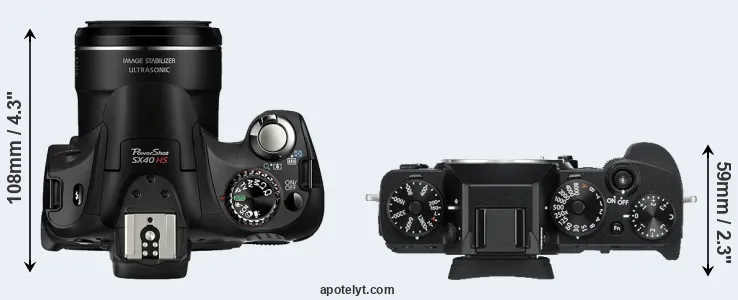 An illustration of the physical size and weight of the Canon SX40 and the Fujifilm X-T3 is provided in the side-by-side display below. The two cameras are presented according to their relative size. Three successive views from the front, the top, and the rear are shown. All width, height and depth dimensions are rounded to the nearest millimeter.