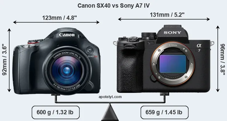 If the front view area (width x height) of the cameras is taken as an aggregate measure of their size, the Sony A7 IV is notably larger (11 percent) than the Canon SX40. It is noteworthy in this context that the A7 IV is splash and dust-proof, while the SX40 does not feature any corresponding weather-sealing.